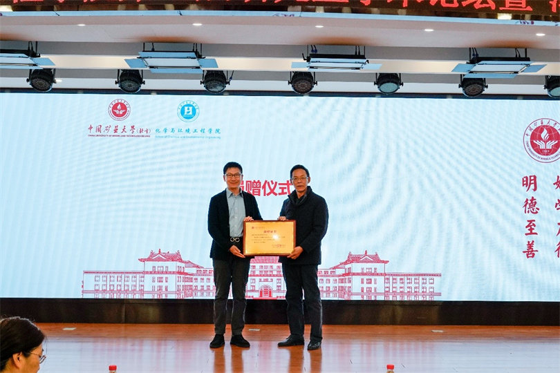 孫吉鵬董事長(zhǎng)向中國(guó)礦業(yè)大學(xué)(北京)內(nèi)蒙古研究院執(zhí)行院長(zhǎng)王國(guó)勇遞交捐贈(zèng)設(shè)備銘牌